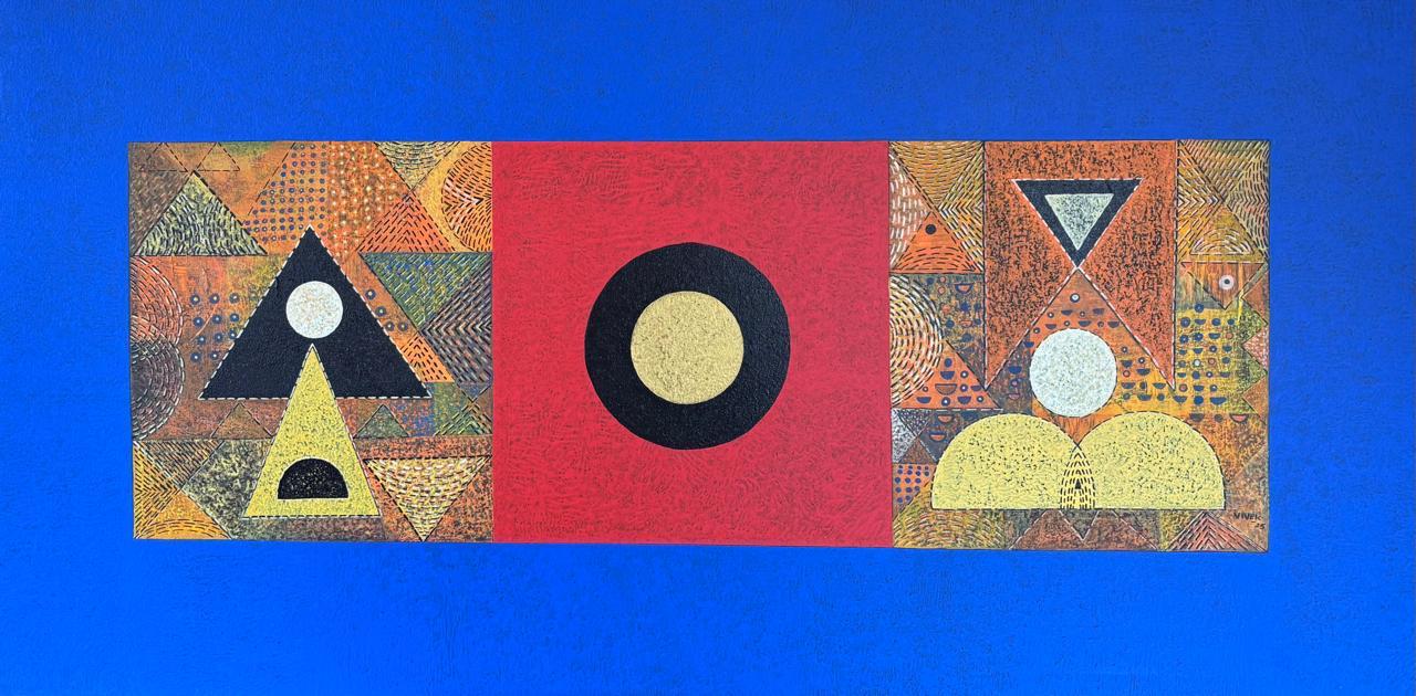Deeply influenced by the spiritual abstraction of Raza, the meditative quiet of Gaitonde, and the lyrical structure of Swaminathan, Vivek’s works reinterpret these legacies through his own lens: earthy, radiant, and deeply personal. His signature “Bindu-like” suns and moons, the play of triangles and circles, and his luminous yellows and reds create a visual language that feels timeless and transcendental.
