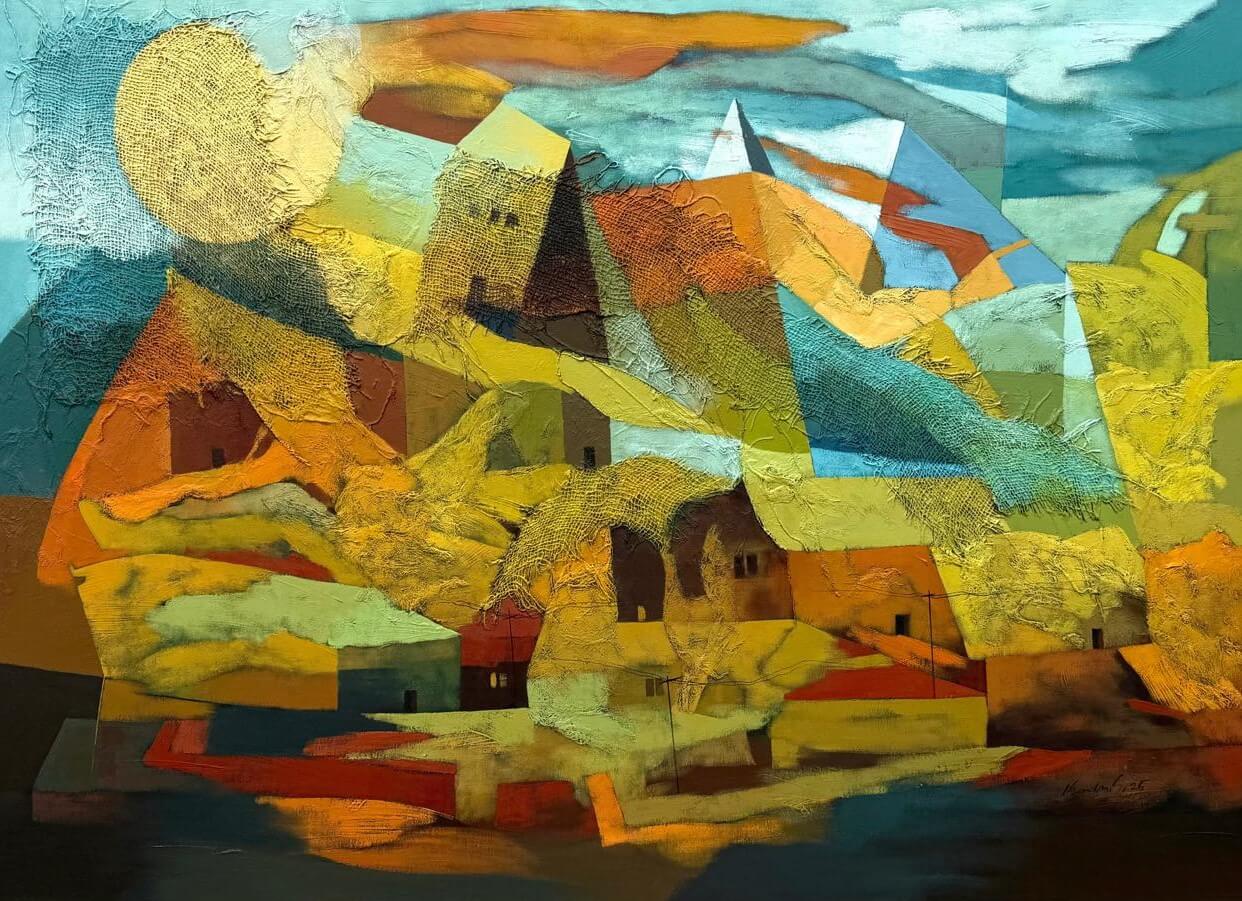 Kandans recent body of work is a testimonial to the visible and invisible realities of the everyday world. Often the appearance of reality in the form of landscapes cityscapes buildings houses huts and other spaces of humanity unfolds in a quite distinctive manner. However it also witnesses the untold story of human catastrophes. The modern industrial revolution has brought a drastic transformation in human lifestyle and everyday spaces. Specifically the built spaces of modernity and the late 20th century represent the urban traffic and complexities of spaces themselves where human habitation is a very integral part. More often the spaces of the human environment are designed incorporating accidentally available negative spaces. These spaces represent the intricacies of human life in the urban landscape. Kandan has made recent observations of the visual spectacle of urbanization into various abstract synopses of colors shapes and forms. Sometimes a semi-figurative closeness to reality moves towards sudden collision. The application of strokes projects the energetic speed and movement cutting across the edge of organic forms and distorting the similarities of the known world and reality. This moment of painterly spontaneity poses the holistic experience of the artists self-experience of reality. In the very process of this artistic journey Kandan re-images the 3-dimensional known world into pure flat shapes. Looking at the entire body of work once again the artist attempts to deconstruct the development of world reality.