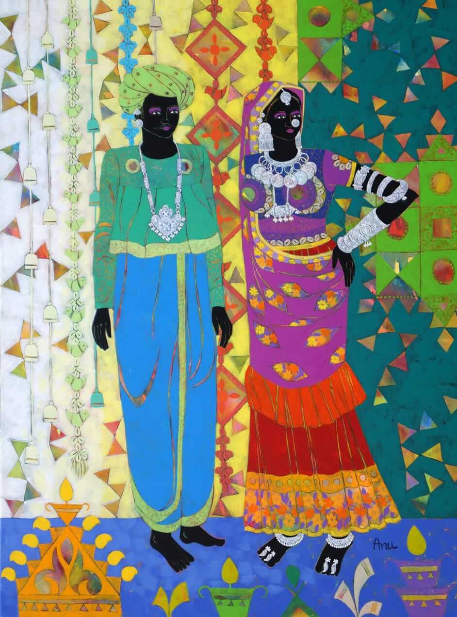 The women in Anuradha Thakur's portraits draw their influence from the tribal women of Adivasis wandering in the deep forests. Her vibrant and ever-so-detailed paintings are drawn into divine balance with elegant and powerful human forms that she consistently depicts with black. Anuradha Thakur spent time studying the lives of the local tribes and possesses an unconditional love for tribal lands which is evidently reflected in her work. The vibrant world of colours in her works is thanks to the inspiration she draws from the Kutch tribe. The textures in her paintings are created by thin black lines that add detail and depth. The signature use of black depicts the bold, vibrant tapestry of tribal life. She finds the tribal people honest, content and peaceful, and would want to find a way to make these qualities stand out in a subtle way; through the use of a soft black. Her works carry an earthiness, the joy of togetherness, a sense of community, and the vibrancy of simple pleasures. Her extraordinary approach to art has made her successful in taking her work to places including the United Nations and the Prime Minister’s Office.