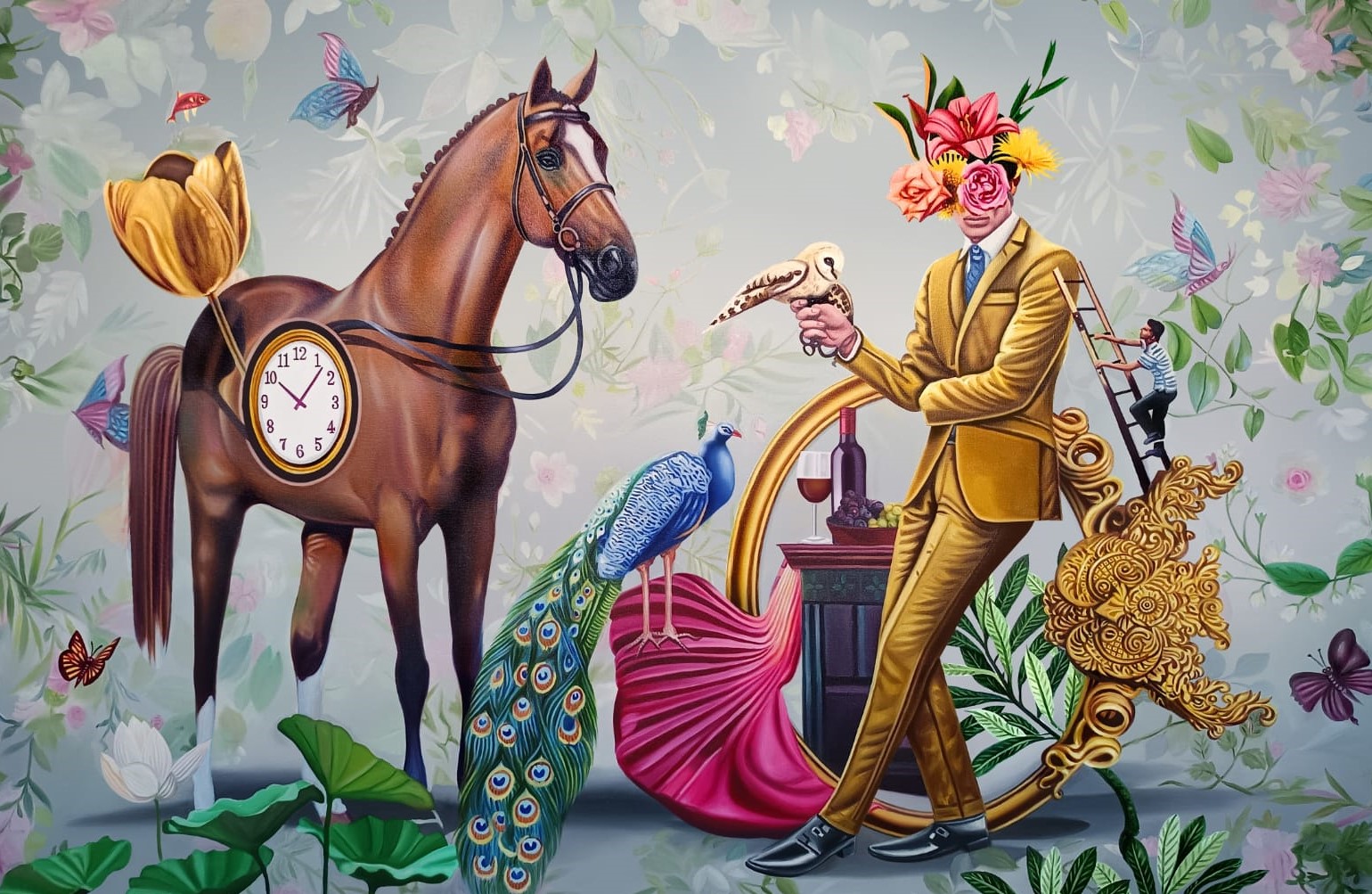 Drawing deeply from Indian mythology and surrealism, Kashi reinterprets gods, goddesses, and fables not as relics of the past but as mirrors of our present. “The story never dies,” he says. “It’s always rewritten to teach us something new.” In his hands, open cages, clocks, birds, and flowers become portals and symbols of liberation, time, and rebirth.
