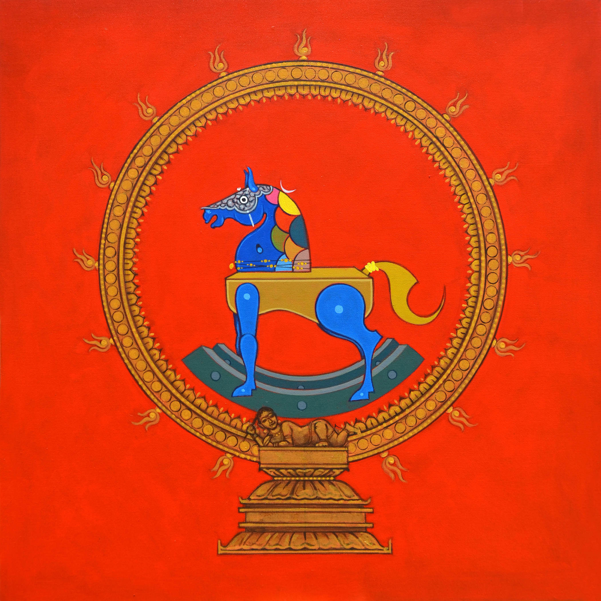 A third-generation painter, sculptor, and installation artist from Telangana, Masuram Ravikanth is the classic definition of Indian Pop-Art. His work is easily recognized by a neo-comic style, unique compositions of antiquities, and royal portraits. Masuram Ravikanth carves out a niche for himself by merging traditional painting styles in the Indian format with photographic morphing to create illusions that nudge the viewer into introspection. His works wander across the terrains of a bygone era and revisit them with a fresh perspective and stylization. You will notice that he blends the excerpts of the historical, personal, and culturally relevant past memoirs including traditional toys and vintage photographs with visual elements picked up from contemporary life with finesse.