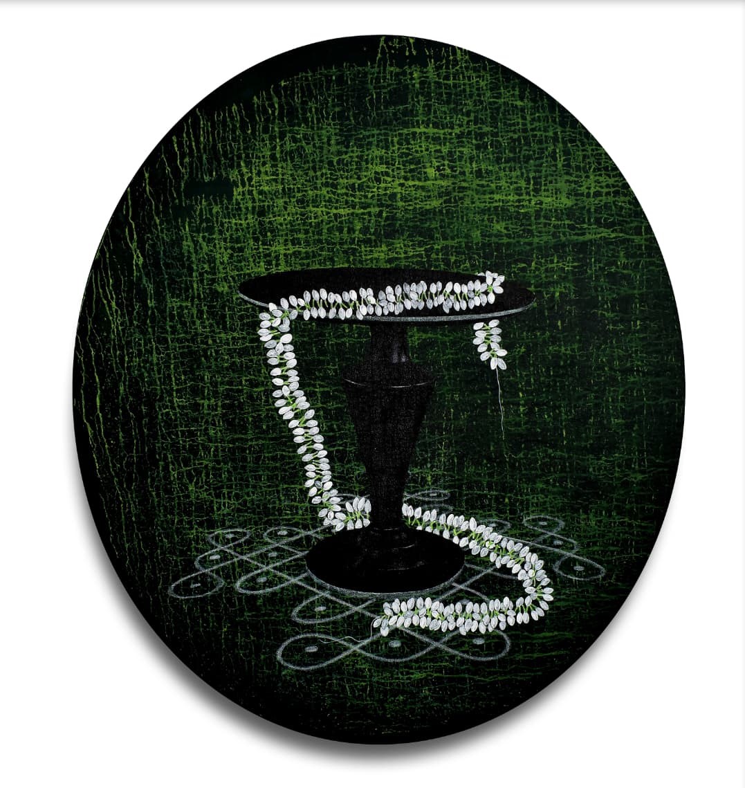 Raju’s conceptual, surrealistic paintings offer a powerful reflection on contemporary life, using familiar symbols like chairs, sofas, and animals to explore themes of power, authority, and human behavior. His large-scale compositions draw viewers into layered narratives that balance thought, emotion, and social commentary. Born in 1989 in Baruva, Andhra Pradesh, Raju holds a BFA from Andhra University (2011) and an MFA from the Government College of Art and Crafts, West Bengal (2013). He has participated in several group exhibitions and continues to be recognized for his compelling visual language.