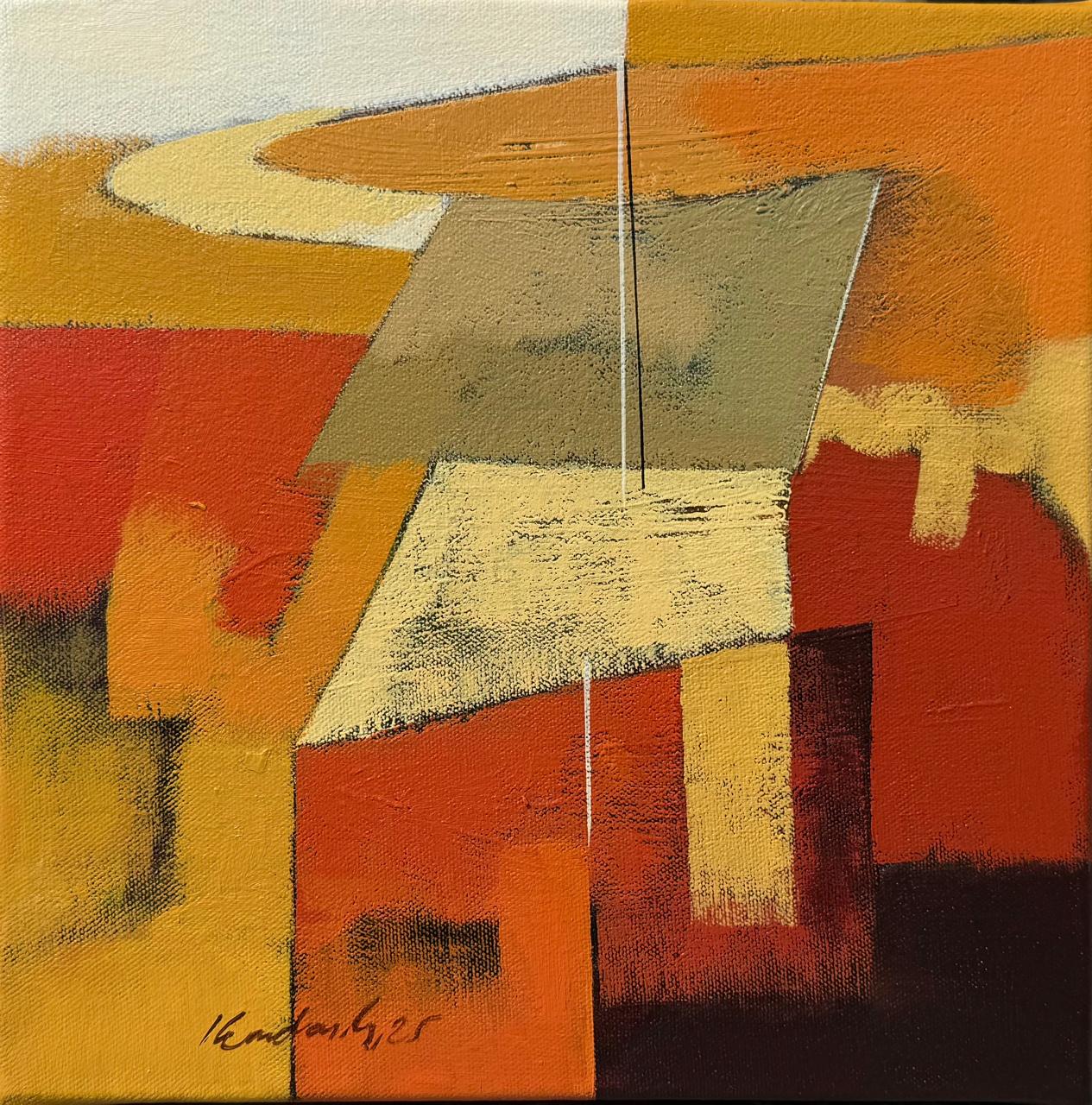Kandans recent body of work is a testimonial to the visible and invisible realities of the everyday world. Often the appearance of reality in the form of landscapes cityscapes buildings houses huts and other spaces of humanity unfolds in a quite distinctive manner. However it also witnesses the untold story of human catastrophes. The modern industrial revolution has brought a drastic transformation in human lifestyle and everyday spaces. Specifically the built spaces of modernity and the late 20th century represent the urban traffic and complexities of spaces themselves where human habitation is a very integral part. More often the spaces of the human environment are designed incorporating accidentally available negative spaces. These spaces represent the intricacies of human life in the urban landscape. Kandan has made recent observations of the visual spectacle of urbanization into various abstract synopses of colors shapes and forms. Sometimes a semi-figurative closeness to reality moves towards sudden collision. The application of strokes projects the energetic speed and movement cutting across the edge of organic forms and distorting the similarities of the known world and reality. This moment of painterly spontaneity poses the holistic experience of the artists self-experience of reality. In the very process of this artistic journey Kandan re-images the 3-dimensional known world into pure flat shapes. Looking at the entire body of work once again the artist attempts to deconstruct the development of world reality.