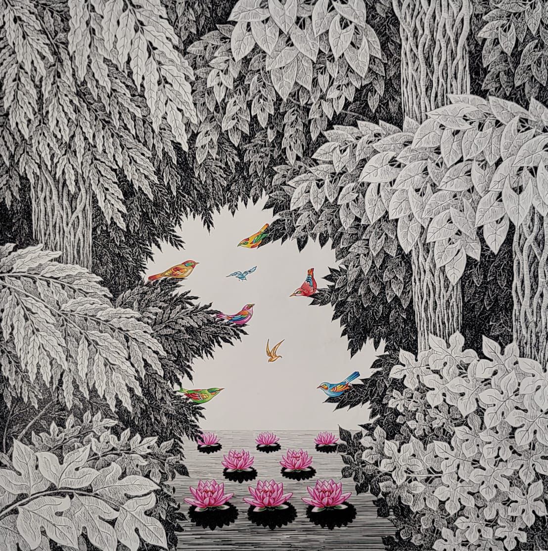 His black-and-white landscapes are dense with detail, like woven layers of silence. And then - a single burst of colour. A flower, or a bird in flight, painted in radiant hues. These luminous elements become the focal point, glowing with quiet intensity against the stark inked background.