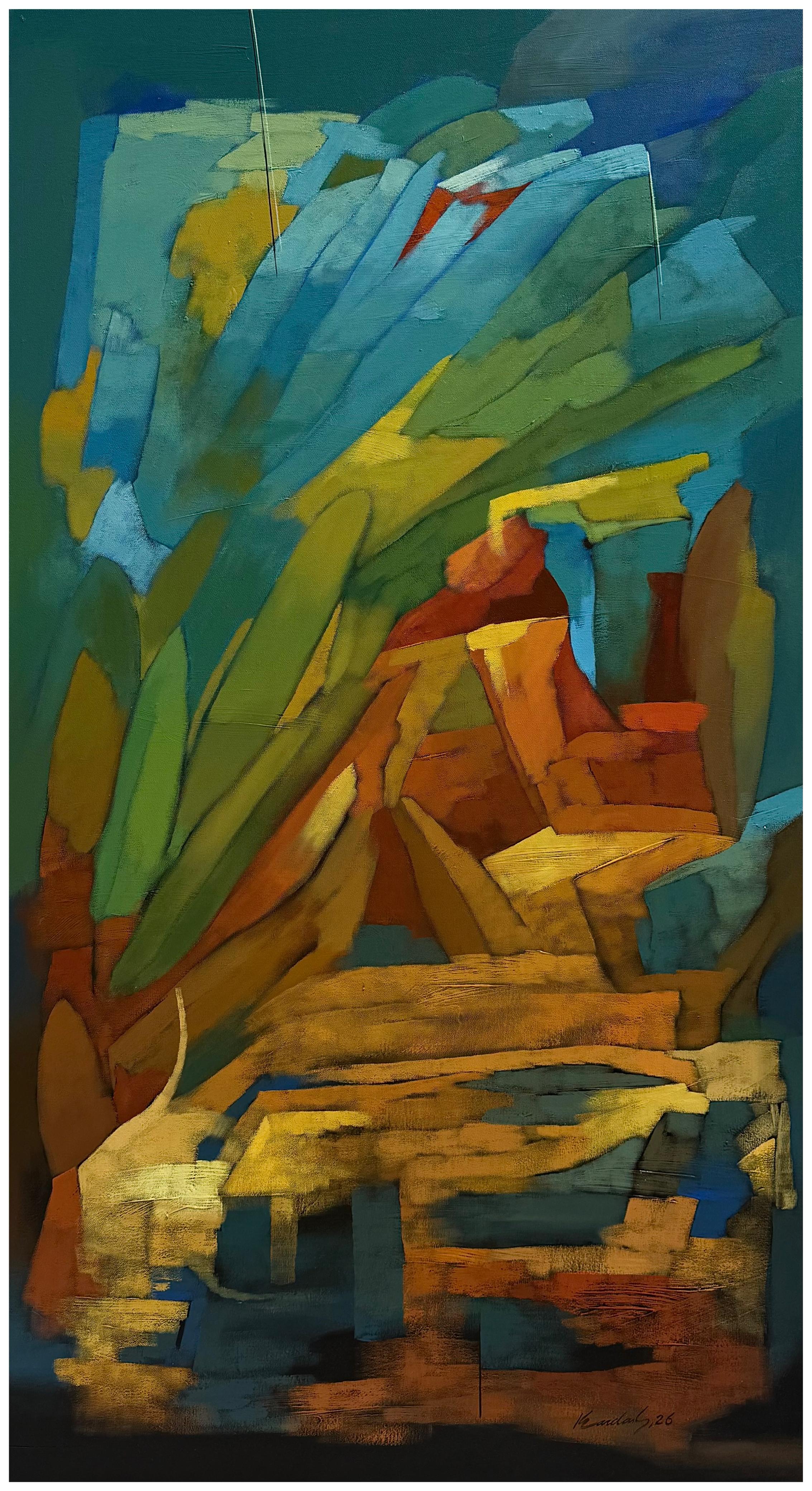 Kandans recent body of work is a testimonial to the visible and invisible realities of the everyday world. Often the appearance of reality in the form of landscapes cityscapes buildings houses huts and other spaces of humanity unfolds in a quite distinctive manner. However it also witnesses the untold story of human catastrophes. The modern industrial revolution has brought a drastic transformation in human lifestyle and everyday spaces. Specifically the built spaces of modernity and the late 20th century represent the urban traffic and complexities of spaces themselves where human habitation is a very integral part. More often the spaces of the human environment are designed incorporating accidentally available negative spaces. These spaces represent the intricacies of human life in the urban landscape. Kandan has made recent observations of the visual spectacle of urbanization into various abstract synopses of colors shapes and forms. Sometimes a semi-figurative closeness to reality moves towards sudden collision. The application of strokes projects the energetic speed and movement cutting across the edge of organic forms and distorting the similarities of the known world and reality. This moment of painterly spontaneity poses the holistic experience of the artists self-experience of reality. In the very process of this artistic journey Kandan re-images the 3-dimensional known world into pure flat shapes. Looking at the entire body of work once again the artist attempts to deconstruct the development of world reality.