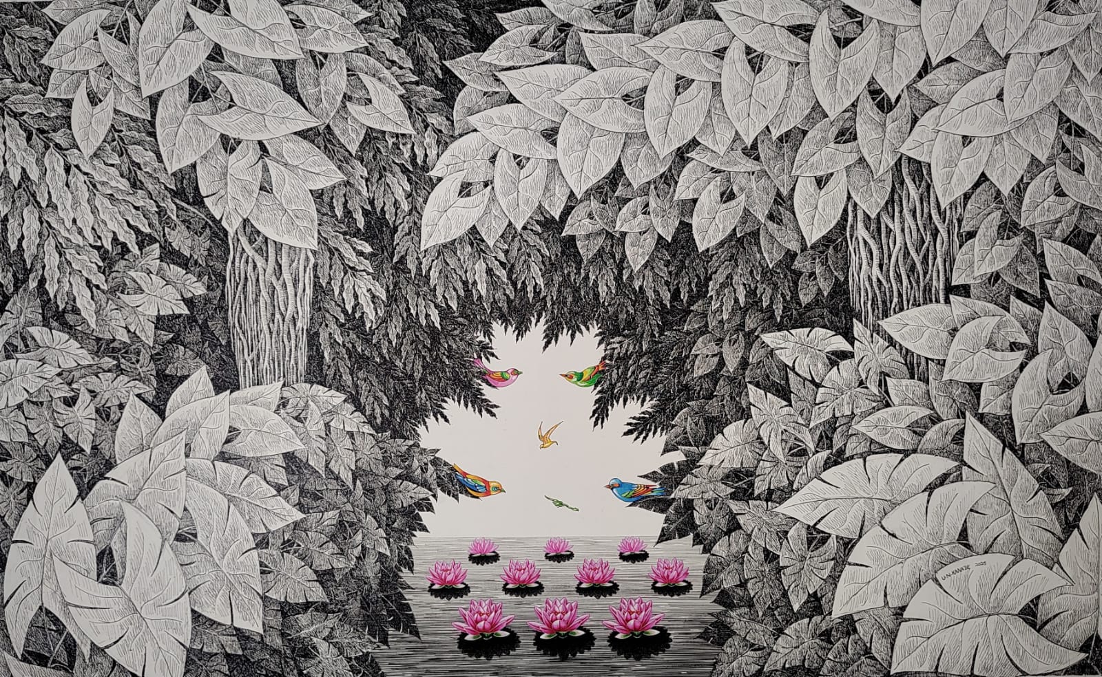 His black-and-white landscapes are dense with detail, like woven layers of silence. And then - a single burst of colour. A flower, or a bird in flight, painted in radiant hues. These luminous elements become the focal point, glowing with quiet intensity against the stark inked background.